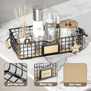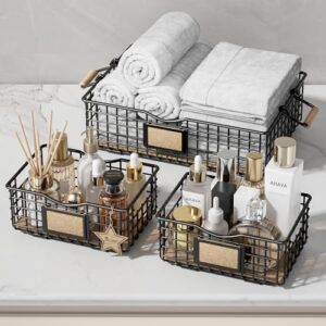 Qcold Wire Storage Basket, Metal Baskets for Shelves, Multipurpose Counter Organizer with Wooden Handles, Decorative Storage Bins for Countertop, Toilet Paper Basket Storage (Set of 3, Black)