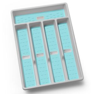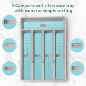 Joequality Silverware Organizer with Icons,Plastic Cutlery silverware Tray for Drawer,Utensil Flatware Tableware Organizer for Kitchen with Non-slip TPR,Fits Standard Drawer,5-Compartment,Grey+Mint
