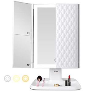 HORM Makeup Mirror Vanity with Lights – 3 Color Lighting Modes 72 LED Trifold Mirror, 1x/2x/3x Magnification, Touch Control Design, Portable High Definition Cosmetic Lighted Up White (JING-007)