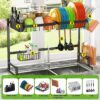 ADBIU Over The Sink Dish Drying Rack (Expandable Height and Length) Snap-On Design 2 Tier Large Dish Rack Stainless Steel (24″ – 35.5″(L) x 12″(W) x 19″ – 22″(H))