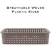 [ STURDY & DURABLE ] Durable and sturdy, the grey storage containers have a woven side aesthetic for open breathable storage and organization. The bins are easy to stack and lightweight when empty. Lower tray style sides for use in larger drawers, cabinets, shelves, or on counters.