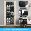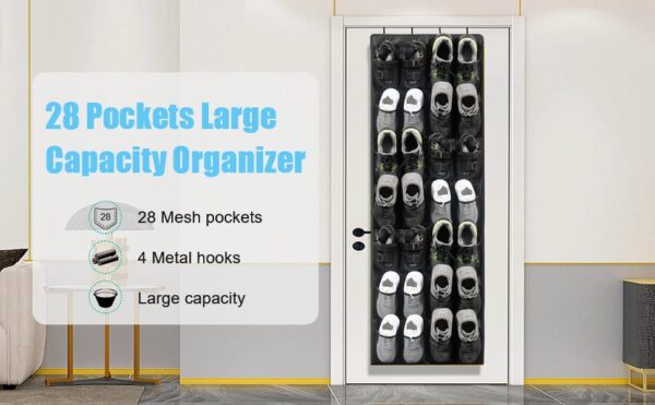 More Pockets:28 Pockets Offers More Space: Compare with 24 shoe door hanger, 28 pockets utilize unused space behind door to fits 14 pairs of large men shoes, size is 65 by 22.6 inches fits entryway normal door, closet door, bedroom door, bathroom door;