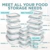 Many Unique Sizes – Food Storage Set Includes SIZE: Rectangular: 150×2, 5 Oz, 370×2, 12.5 Oz 640×2, 22 Oz 1040×1, 35.2 Oz 1520×1, 51.4 Oz SQUARE: 320X2, 10.8 Oz 520X2, 17.9 Oz 800X2, 27 OZ 1200X1, 40.5 OZ