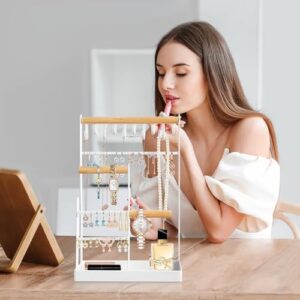 ProCase Jewelry Holder Organizer Jewelry Stand, 4-Tier Cute Jewelry Rack Display Tower Necklace Stand with 10 Hooks, Aesthetic Jewelry Tree Bracelet Watch Holder with 16 Earring Holders -White