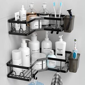 AKTECKE Corner Shower Caddy, 2 Pack Adhesive Shower Corner Organizer Shelves, No Drilling Stainless Steel Shower Storage Rack with Hooks&Toothpaste Holder for Bathroom, Dorm and Kitchen